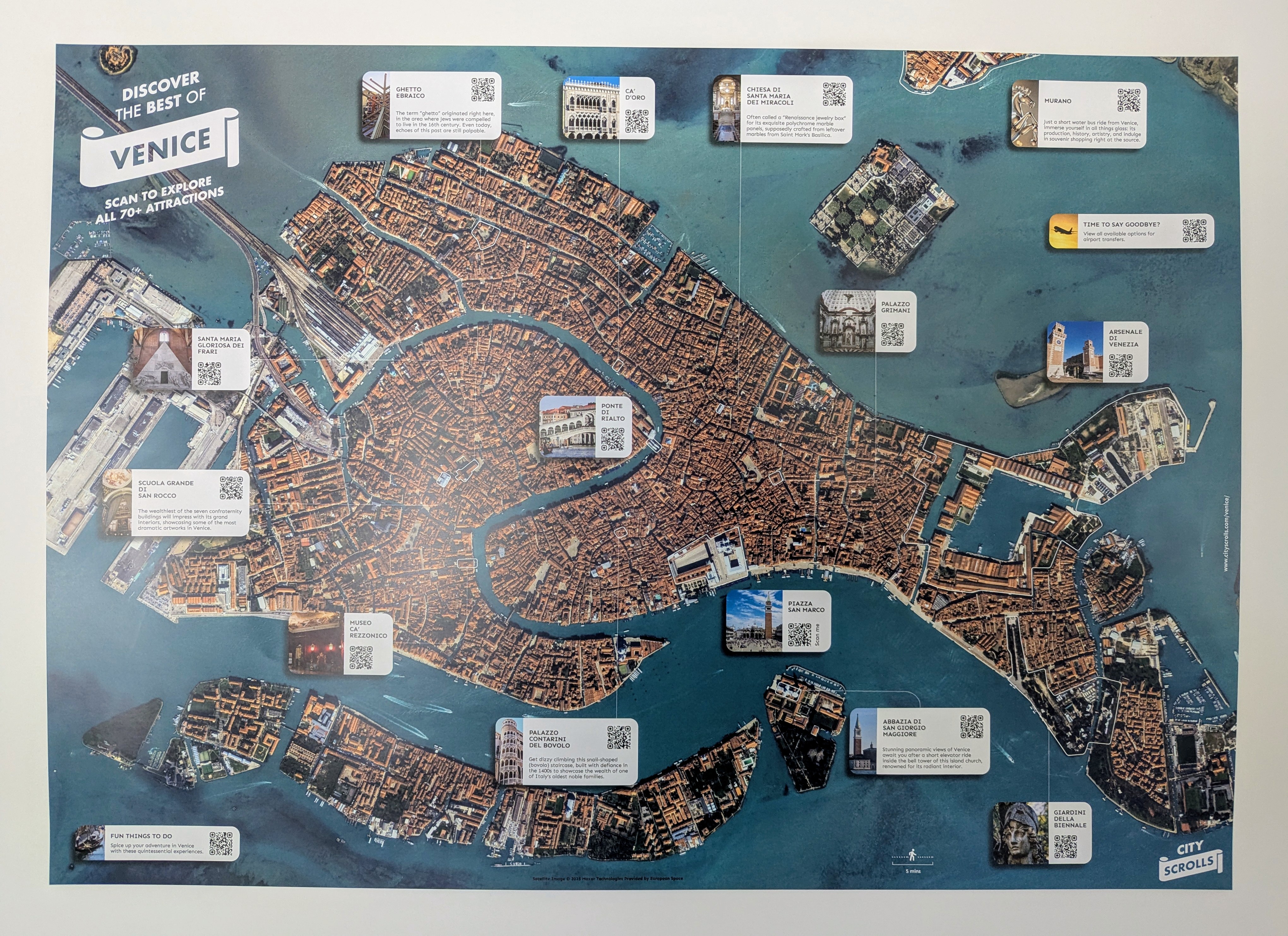 Prima di partire per il centro storico (la parte di Venezia sull’acqua), abbiamo notato sulla parete della reception del nostro camping una curiosa mappa-poster di Venezia (foto sopra) con molti codici QR da scansionare.