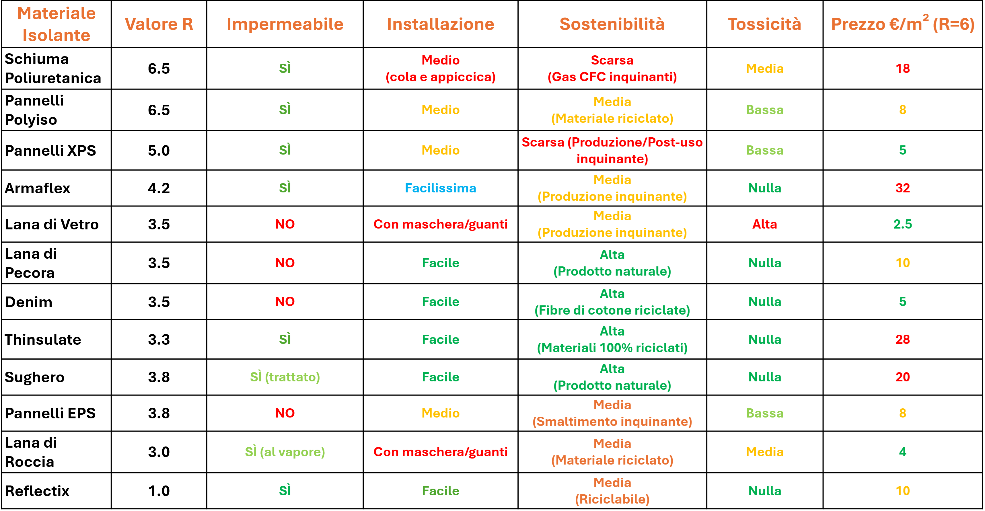 NOTA: I valori espressi nella tabella sono indicativi di un prodotto medio e non sono precisi alla virgola. Alcuni produttori possono essere più sostenibili di altri ed ovviamente i prezzi possono oscillare nel tempo. La tabella è stata creata con lo scopo di darti un’immagine generale dei materiali disponibili e delle loro proprietà: poi ovviamente, per scegliere il meglio per il tuo progetto, dovrai sempre valutare le caratteristiche e la convenienza dei prodotti che troverai intorno a te.